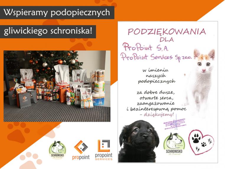 Jak co roku, w okresie przedświątecznym, organizujemy pracowniczą akcję charytatywną. Tym razem zdecydowaliśmy się na wsparcie Schroniska dla Zwierząt w Gliwicach. Za zebrane środki kupiliśmy najpotrzebniejsze rzeczy: karmę dla kotów i psów, tabletki odrobaczające i na pchełki, żwirek dla kotów oraz oraz środki higieniczne i czyszczące.