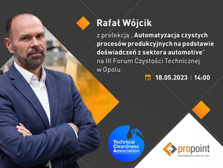 Automation of clean production processes based on the automotive sector was the topic of PROPOINT S.A. presentation at the 3rd Technical Cleanliness Forum in Opole. During the lecture, we will convey our approach to the design and subsequent implementation of automated production lines under strict cleanliness standards. The speaker of the session will be Rafal Wójcik - Chief Operating Officer of PROPOINT S.A. Machine Building Department! We invite you to attend!